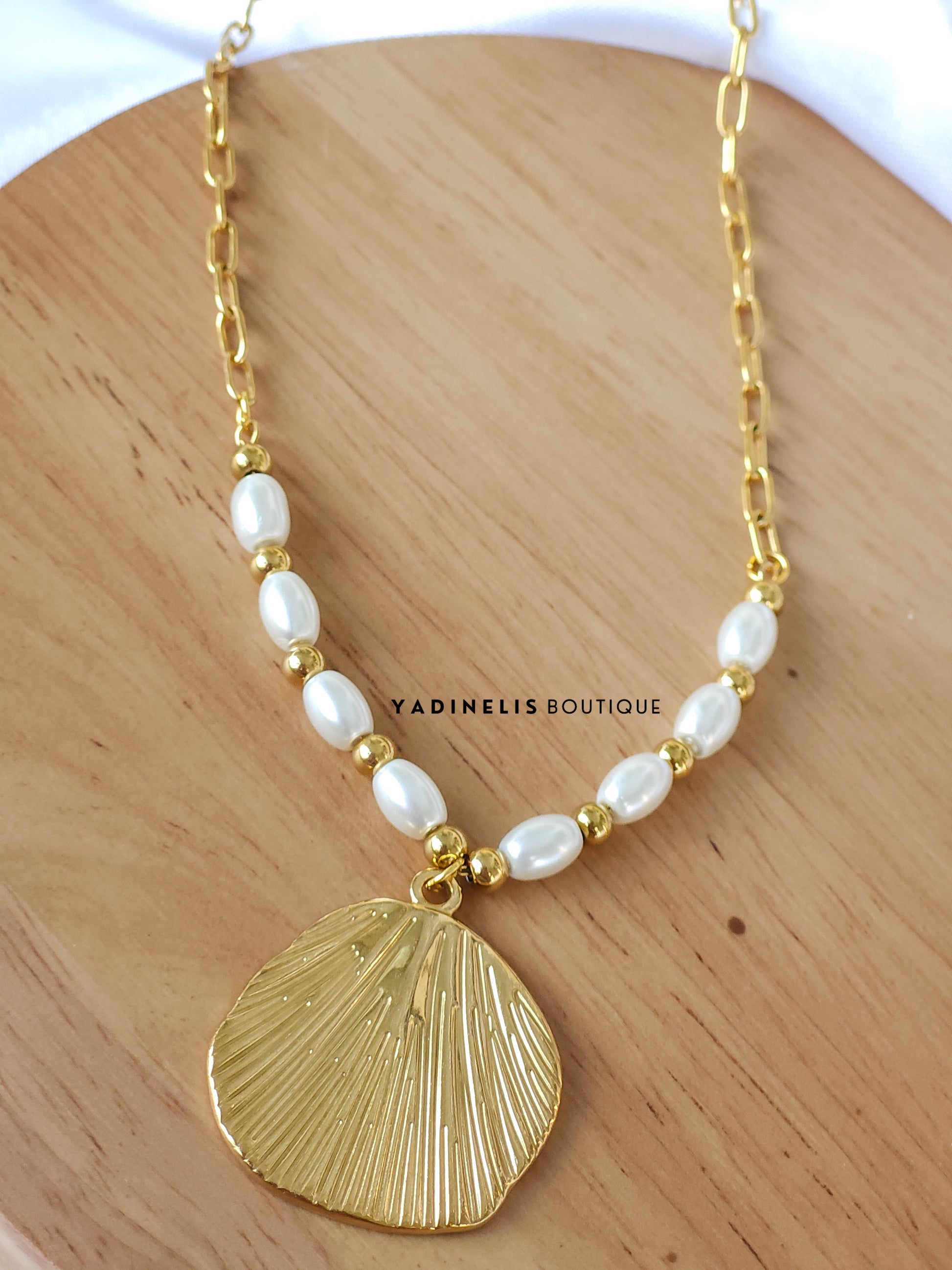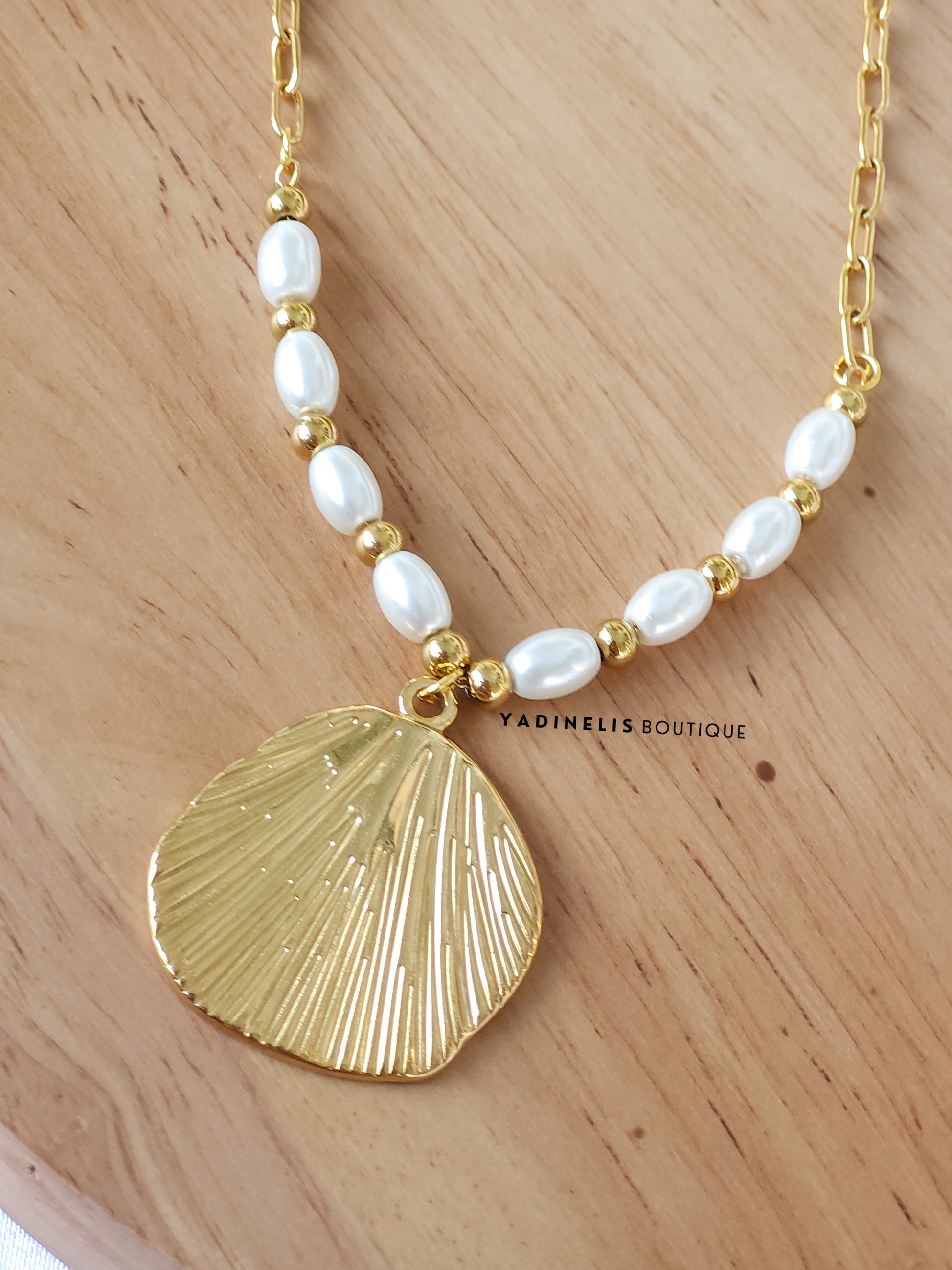 Collar dorado combinado con perlas blancas y detalles metálicos.
